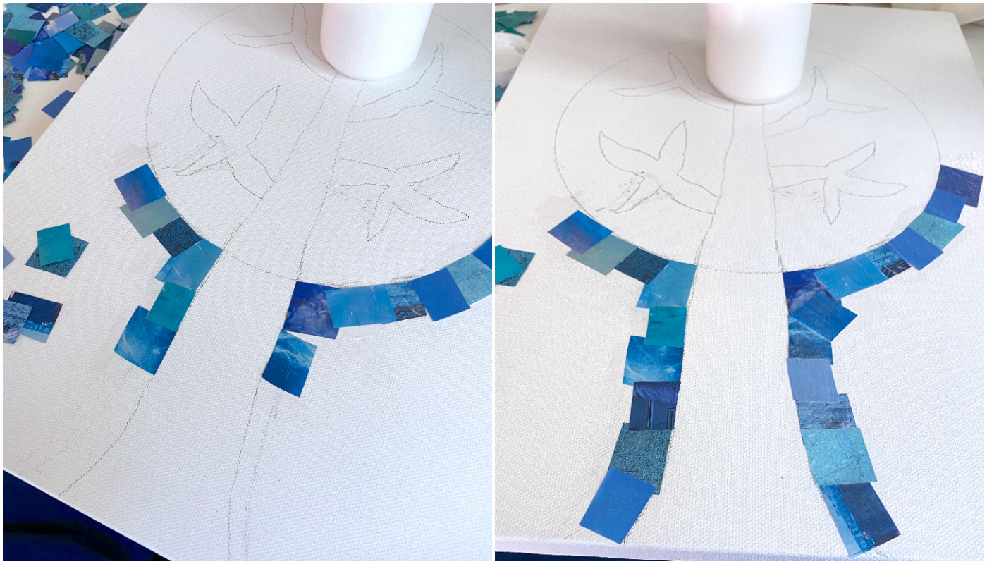 - Work your way around the main design, adding pieces of magazine in various shades of blue. Space them out and overlap in various ways so the pieces don’t look like shingles.