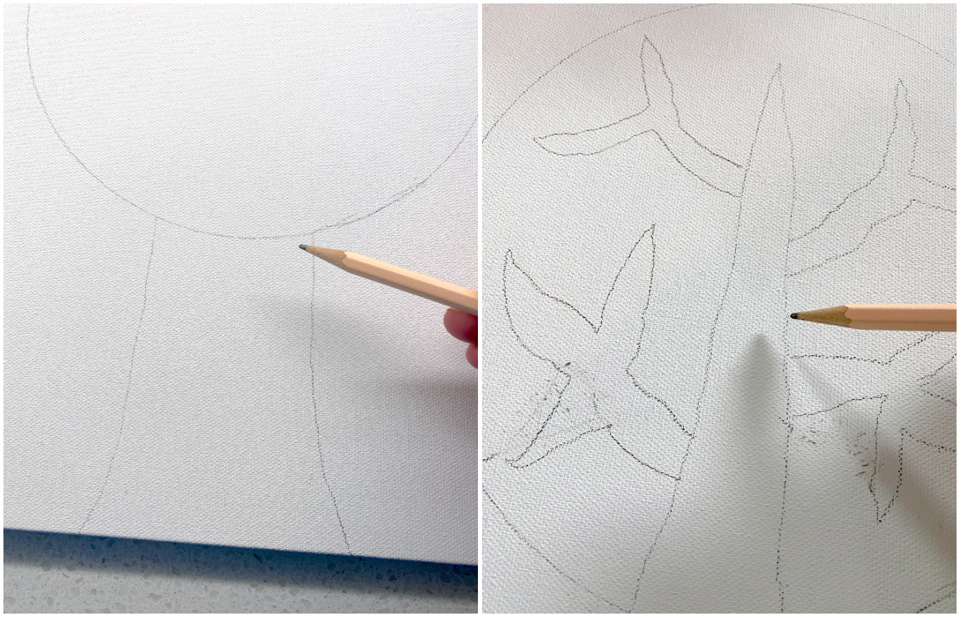 - Place the canvas on your work surface and draw your design. To create the tree, place a bowl or other round object in the center of the canvas and trace with a pencil.